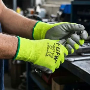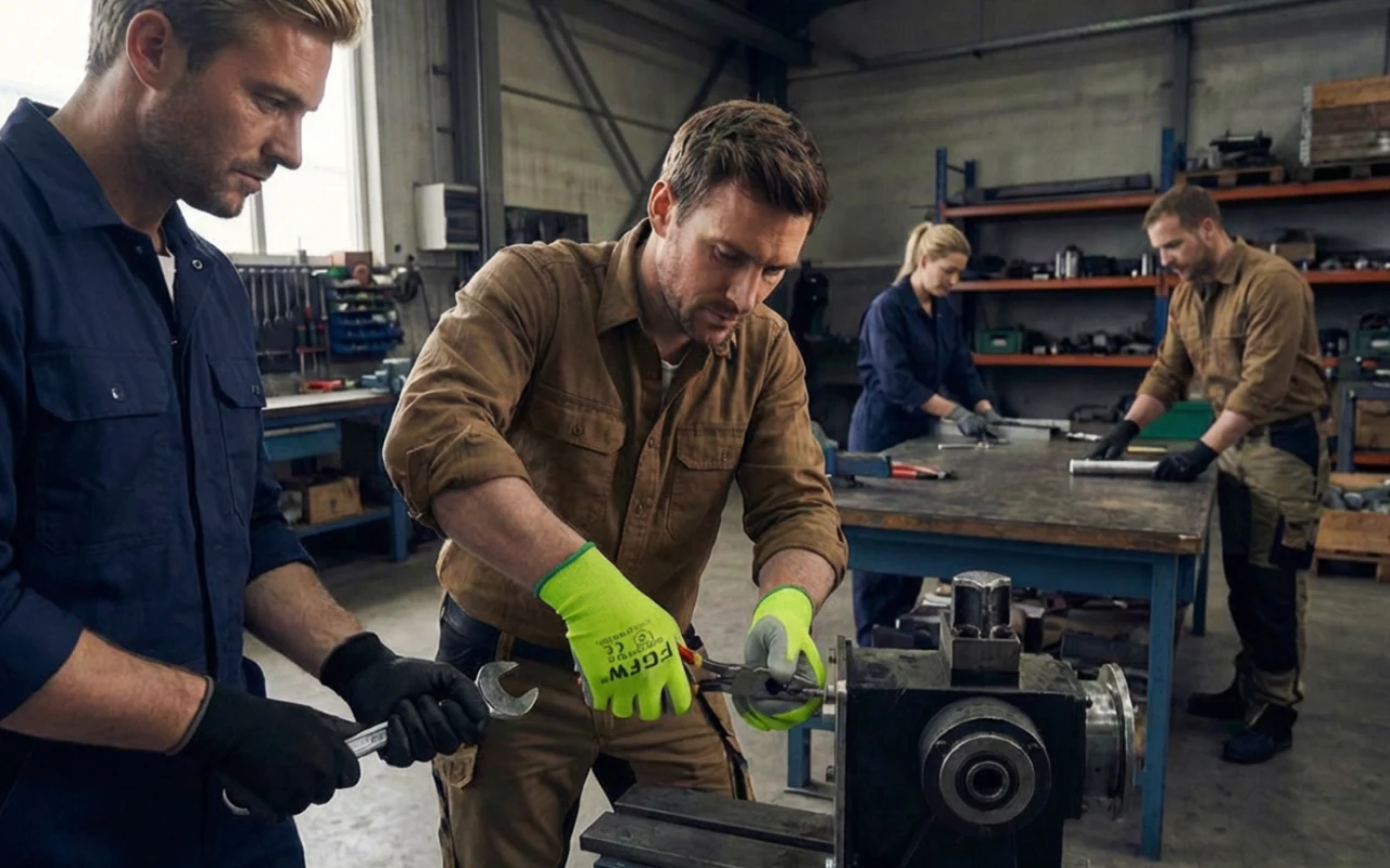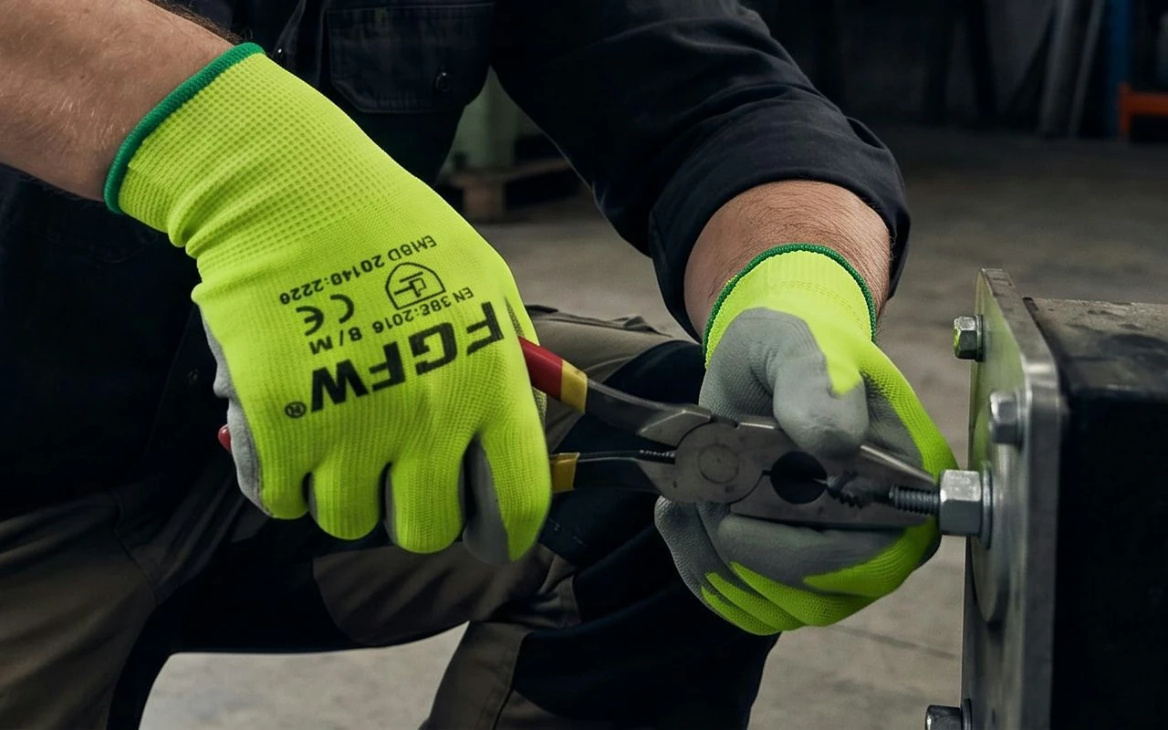 Helles fluoreszierendes Gewebe macht die Handpositionen in dunklen Bereichen gut sichtbar. Teams erkennen Signale sofort, was hilft, gefährliche Fehler an Maschinen zu vermeiden.
