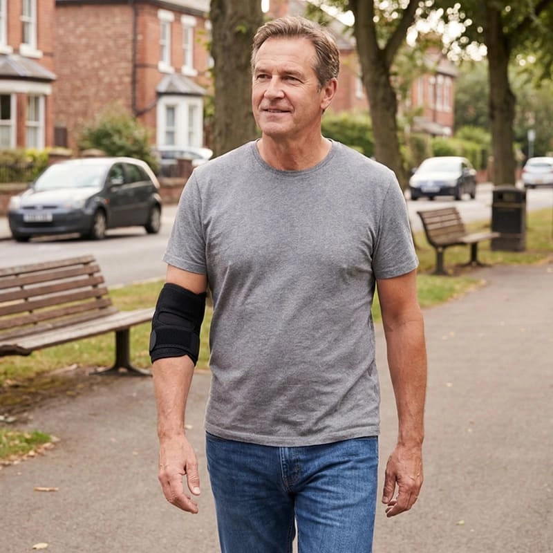 Ich mag, dass ich sie leicht anpassen kann. Sie bleibt beim Gärtnern oder beim Spaziergang mit dem Hund an Ort und Stelle, und mein Ellbogen fühlt sich super an.