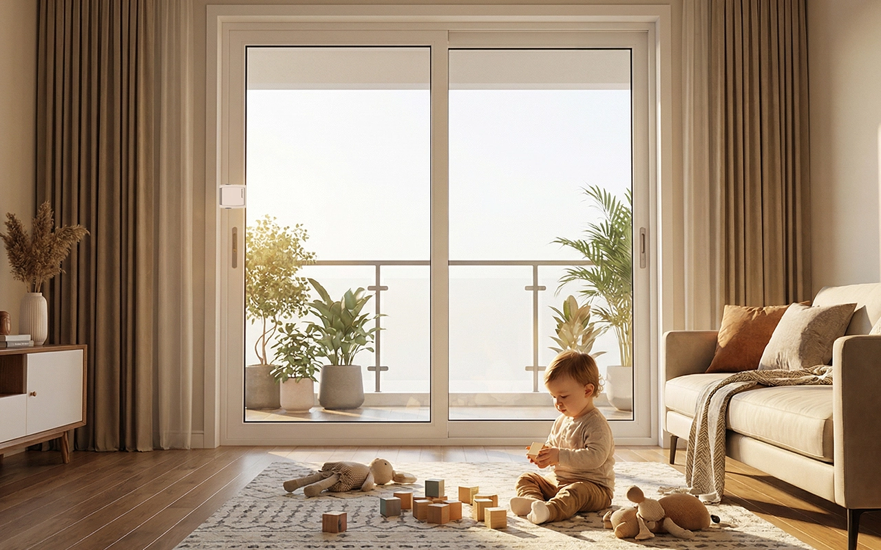 Kinder sind überall geschützt, wo sie drinnen spielen. Blockiert riskante Öffnungen an Schiebetüren oder Fenstern ganz einfach.