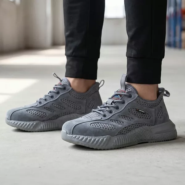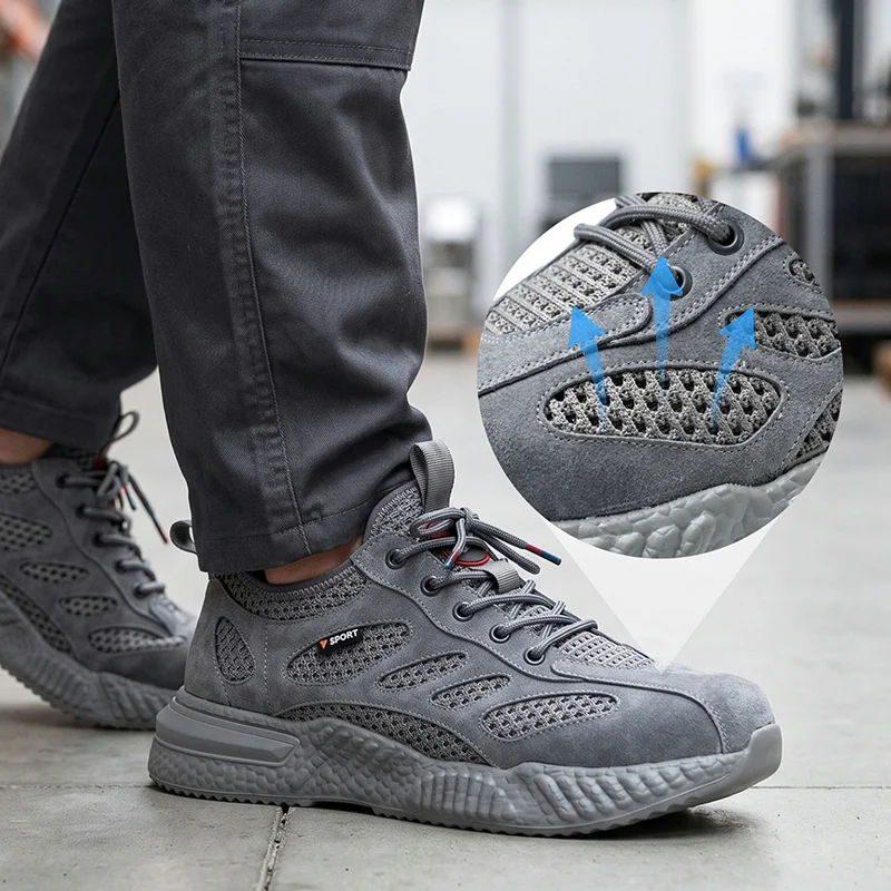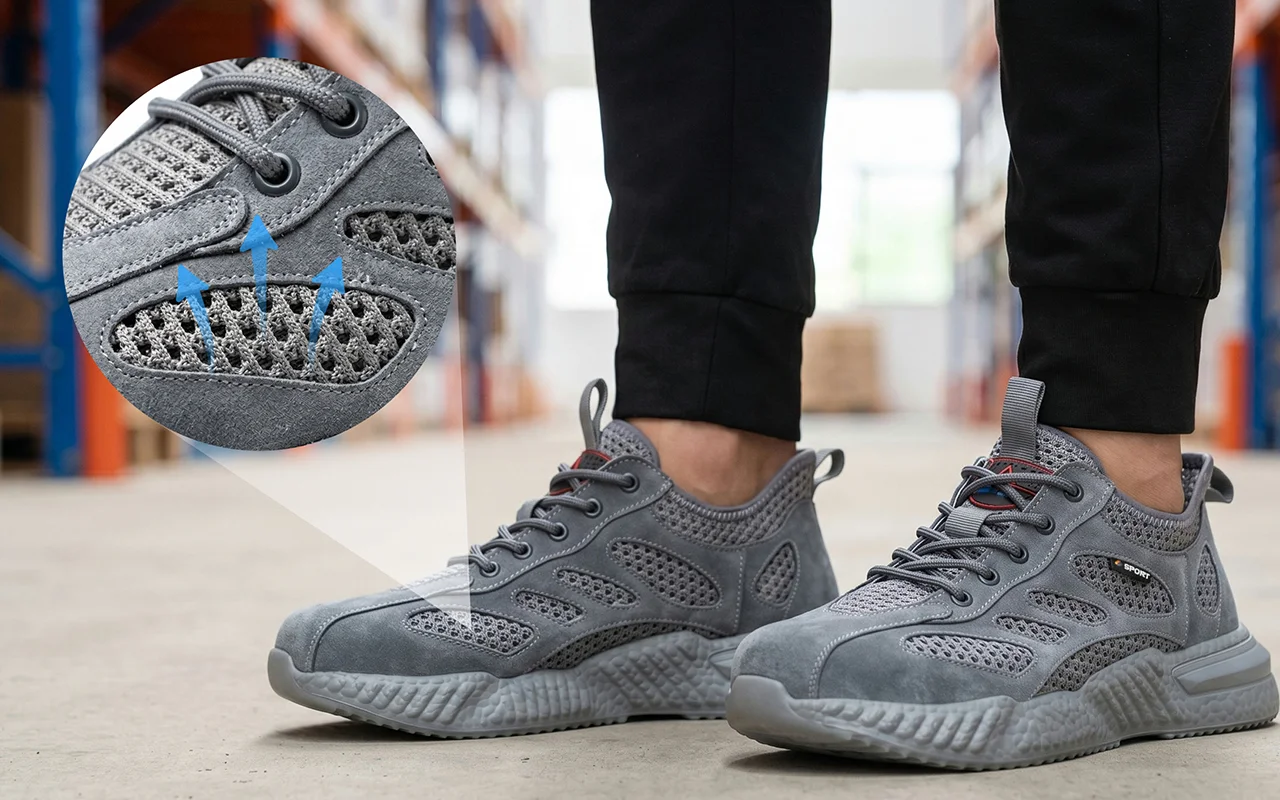 Ich stehe den ganzen Tag an einer Maschine. Diese Mesh-Schuhe verhindern, dass meine Füße überhitzen, die Dämpfung fühlt sich angenehm an, und die rutschfeste Sohle hält mich auf öligen Stellen stabil.