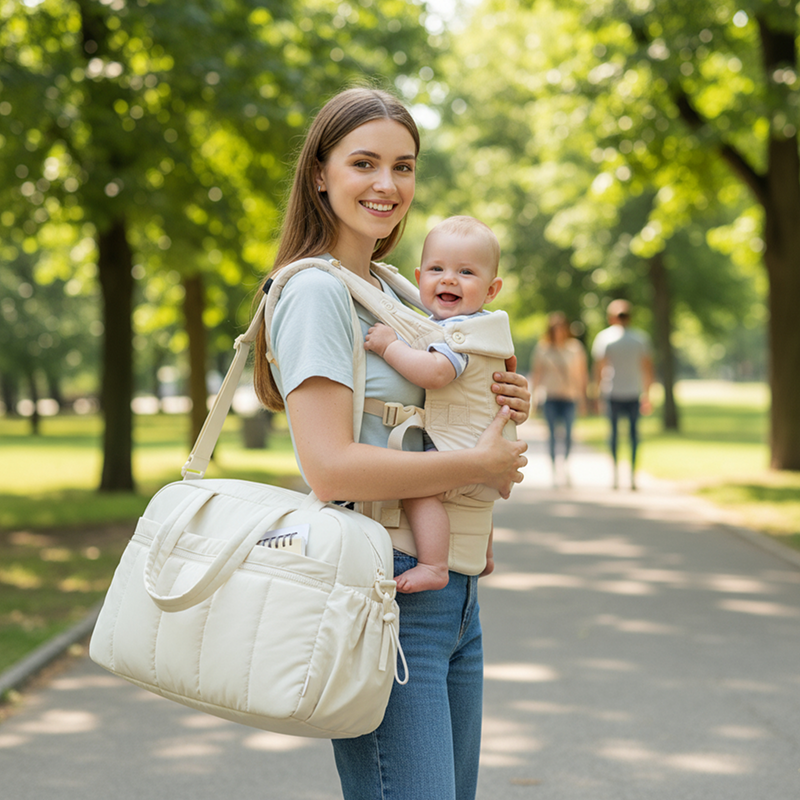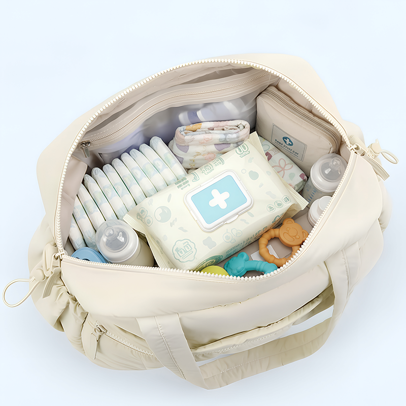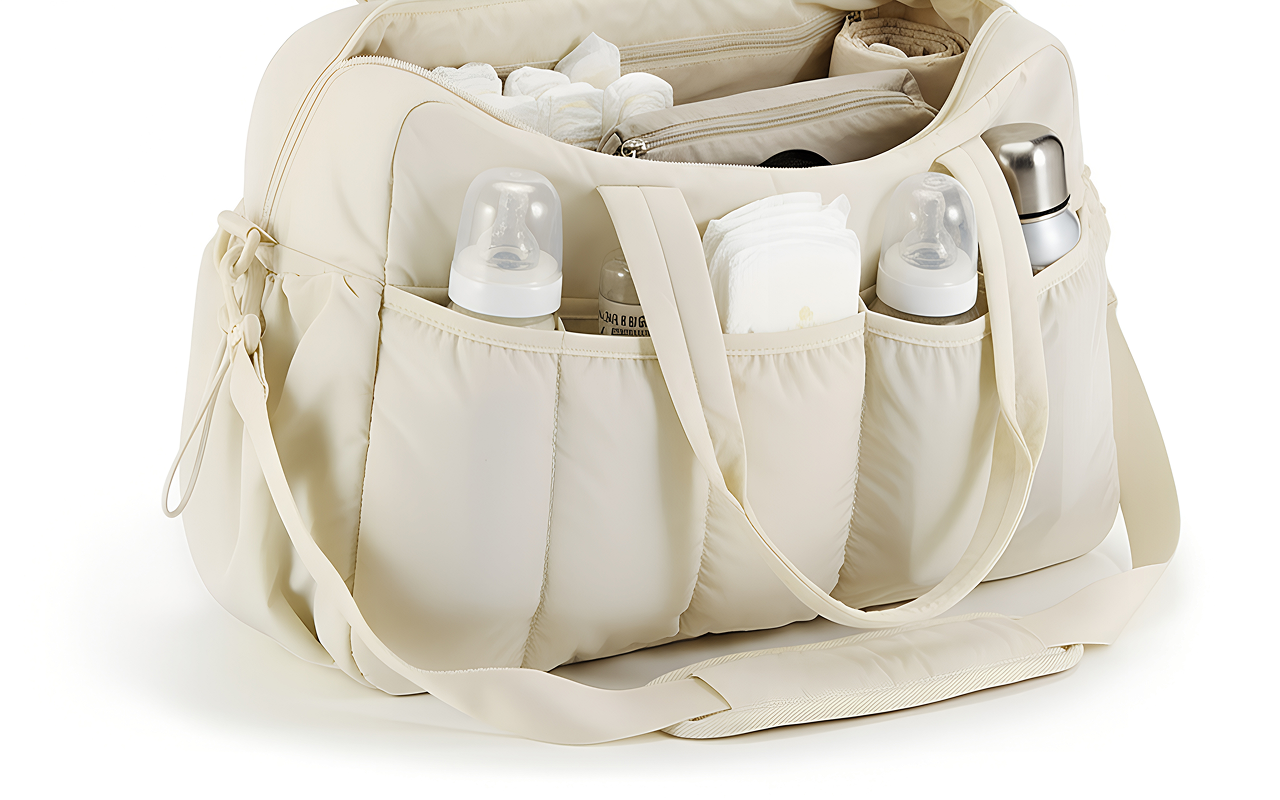 Mehrere Taschen trennen Windeln, Feuchttücher und Flaschen schnell. Alles bleibt ordentlich, sodass nichts verloren geht oder zerquetscht wird.
