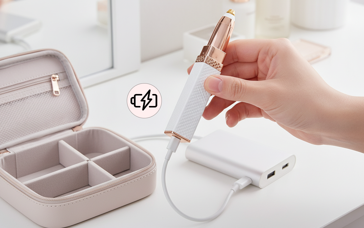 USB-Aufladung bedeutet, dass keine Batterien Ihre Routine unterbrechen. Die kompakte Größe passt perfekt in jede Tasche oder jeden Beutel.
