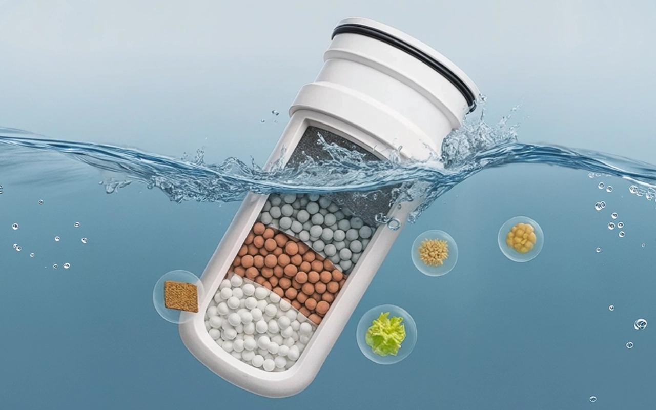 Ein Keramikelement fängt Rost und Sedimente auf mikroskopischer Ebene auf. So gelangt bei jeder Nutzung nur klares Wasser hindurch.