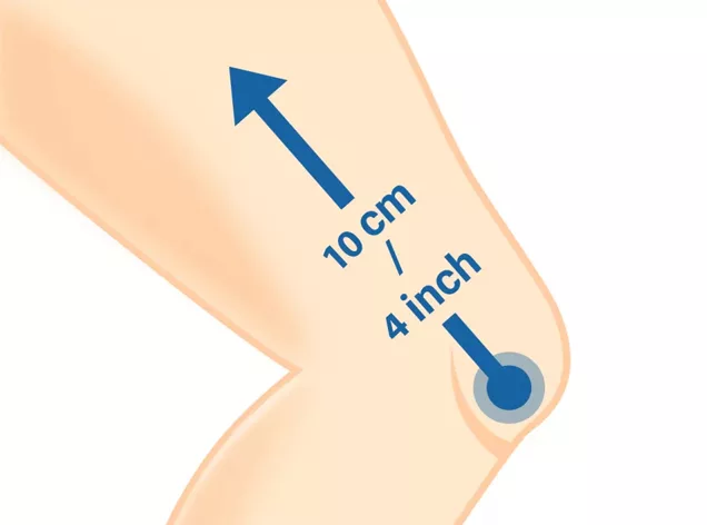 - 2. Legen Sie das Maßband um den breitesten Teil Ihres Oberschenkels, etwa 10cm/4" oberhalb der Mitte Ihrer Kniescheibe.