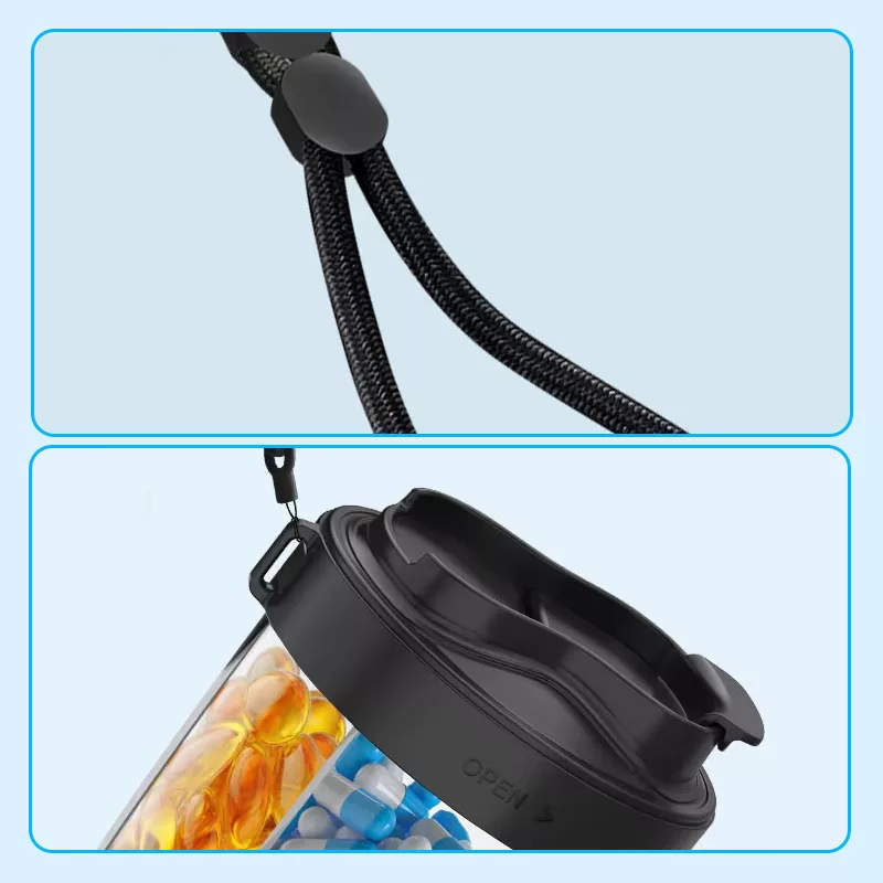 Der Gurt ermöglicht es mir, das Etui an meinen Rucksack zu hängen. Kein Durcheinander, hält sogar größere Kapseln. Fühlt sich an, als wäre es für Reisen gemacht.