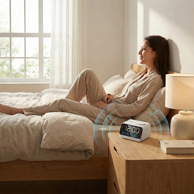 Stellen Sie zwei getrennte Alarme ein, um Routinen einfach und zuverlässig zu halten. Wählen Sie sanfte Musik oder lebhaftes Radio, um ruhig und bereit in den Tag zu starten.