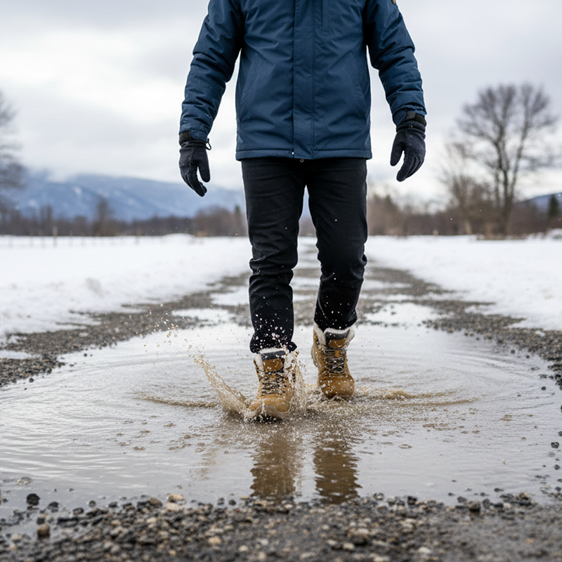 Eine spezielle Barriere hält Pfützen, Schnee und Spritzer zuverlässig fern. Nasse Socken oder eiskaltes Wasser verderben Ihnen nicht mehr den Tag.