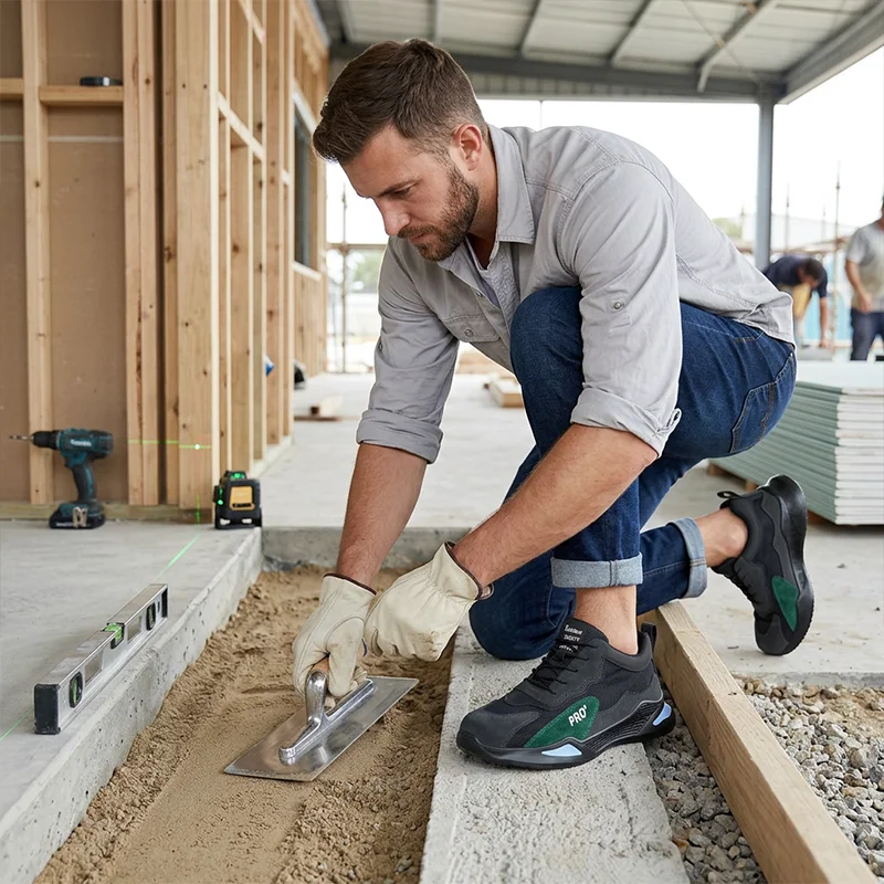Ich arbeite in einem Bauteam und stehe den ganzen Tag an Mischern. Diese Schuhe haben lose Schrauben einfach weggesteckt, und die Zehenkappe hat problemlos einen Schlag von einem Stück Ziegel ausgehalten.