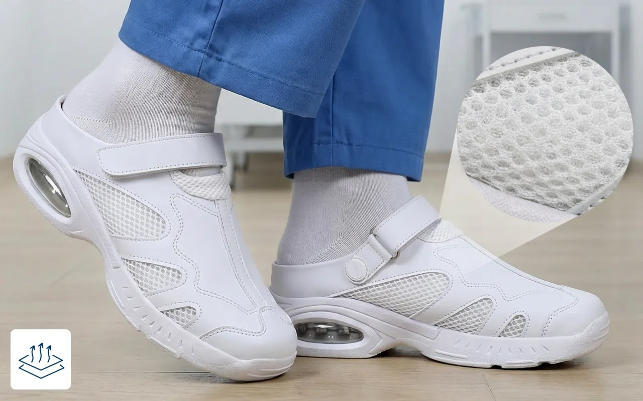 Mesh-Obermaterial sorgt für kontinuierlichen Luftstrom und verhindert Überhitzung. Füße bleiben während Ihrer Schicht trocken und bequem.