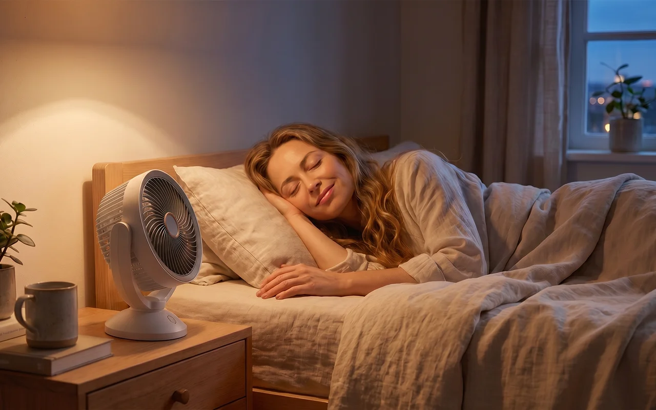Geringe Lautstärke unterstützt einen tieferen Schlaf an warmen Abenden. Sanfter Luftstrom reduziert stickige Luft und hilft, den Geist schneller zur Ruhe kommen zu lassen.