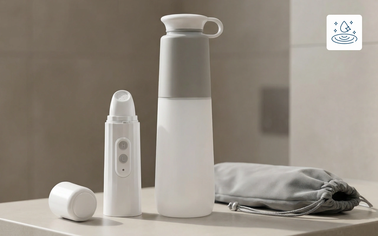 Ob unterwegs oder auf Reisen – Hygiene ist oft schwierig. Das tragbare Bidet von Ortorex ermöglicht eine sanfte Reinigung schnell und einfach. Leicht und diskret passt es ordentlich in Ihre Tasche. Genießen Sie Komfort und Selbstvertrauen jeden Tag, wohin Sie das Leben auch führt.