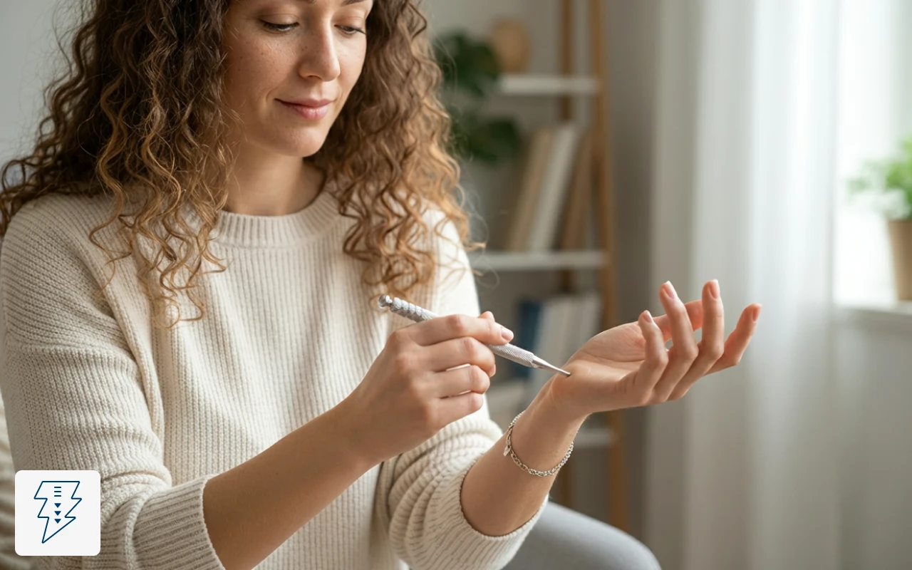 Nach langen Schichten auf den Beinen fahre ich mit dem Stift an meinen Knöcheln und Schienbeinen entlang. Er übt einen sanften Druck aus, der die Schmerzen lindert, ganz ohne Batterien.