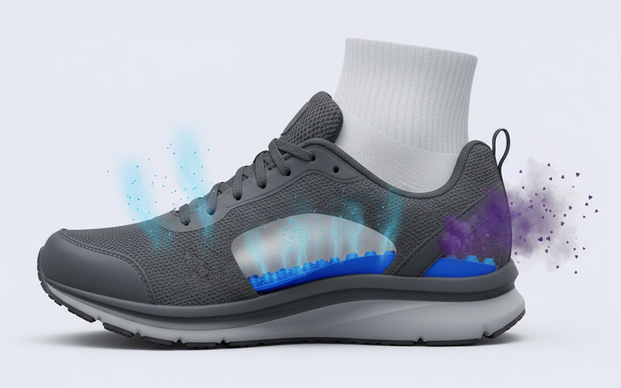 Halten Sie Schuhe frisch, indem Sie die Entstehung unangenehmer Gerüche im Inneren verhindern. Atmungsaktives Material lässt die Haut trocken und bequem bleiben.