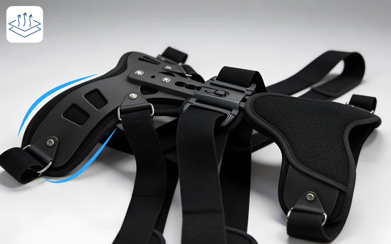 Atmungsaktive Materialien halten die Haut kühl und trocken. Leichte Platten und Stützstangen bieten überall anhaltenden Komfort.