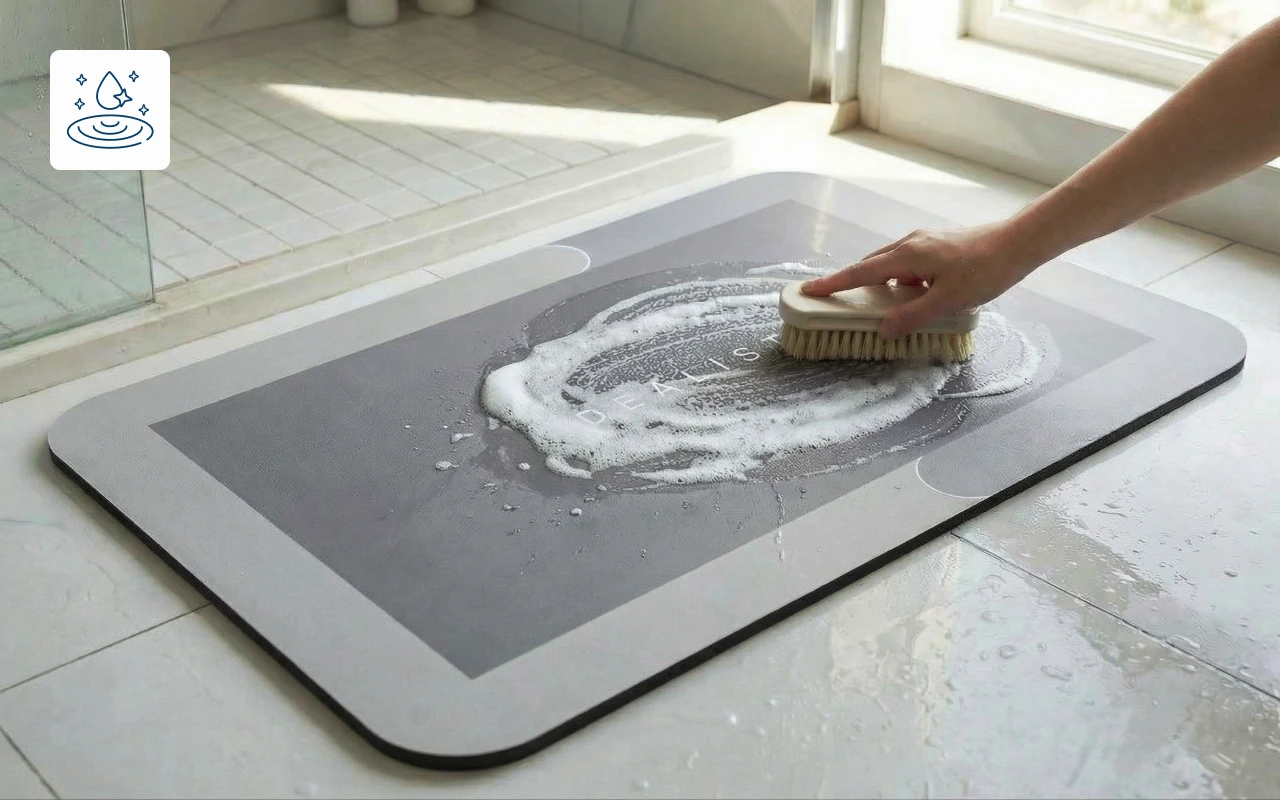 Ich habe noch nie gesehen, wie Wasser so schnell verschwindet. Die Matte fühlt sich immer trocken an, wenn ich sie benutze, was großartig ist. Die Reinigung geht einfach mit einem schnellen Wischen – total unkompliziert.