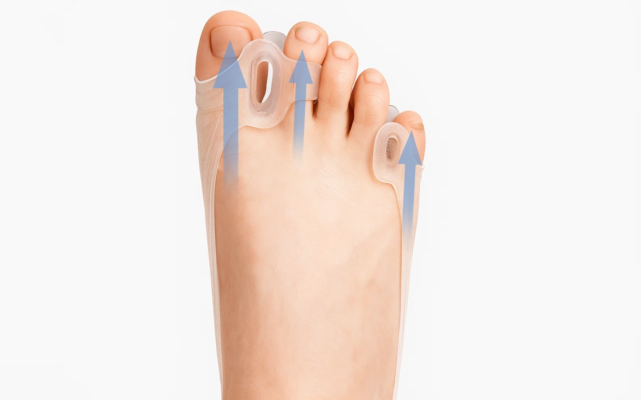 Hilft, die Zehen zu begradigen, ohne Unbehagen oder Stress zu verursachen. Hält jedes Gelenk stabil, sodass sich Bewegungen geschmeidig anfühlen.