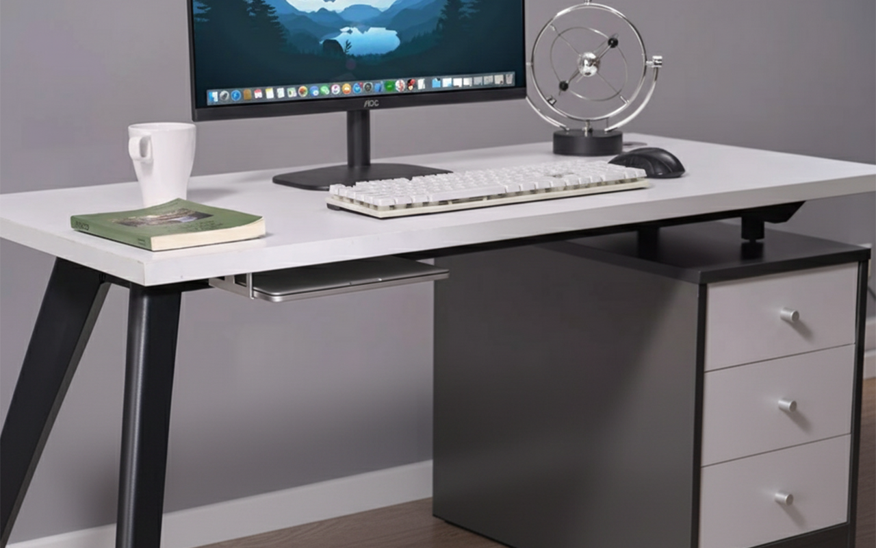Eine große Hilfe fürs Fernstudium. Mein Laptop ist ordentlich unter dem Schreibtisch verstaut, sodass mir beim Unterricht nichts im Weg ist.