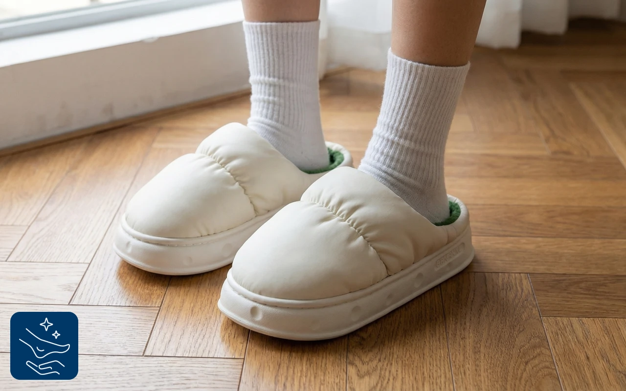 Diese flauschigen Hausschuhe sind so gemütlich und halten meine Füße an kalten Morgen super warm. Kein Druck oder Engegefühl, einfach bei jedem Schritt weicher Komfort.