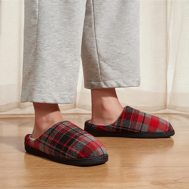 Diese karierten Hausschuhe nach der Arbeit zu tragen, ist das Beste. Innen weich, super einfach anzuziehen und meine Fersen fühlen sich jetzt total entspannt an.