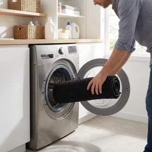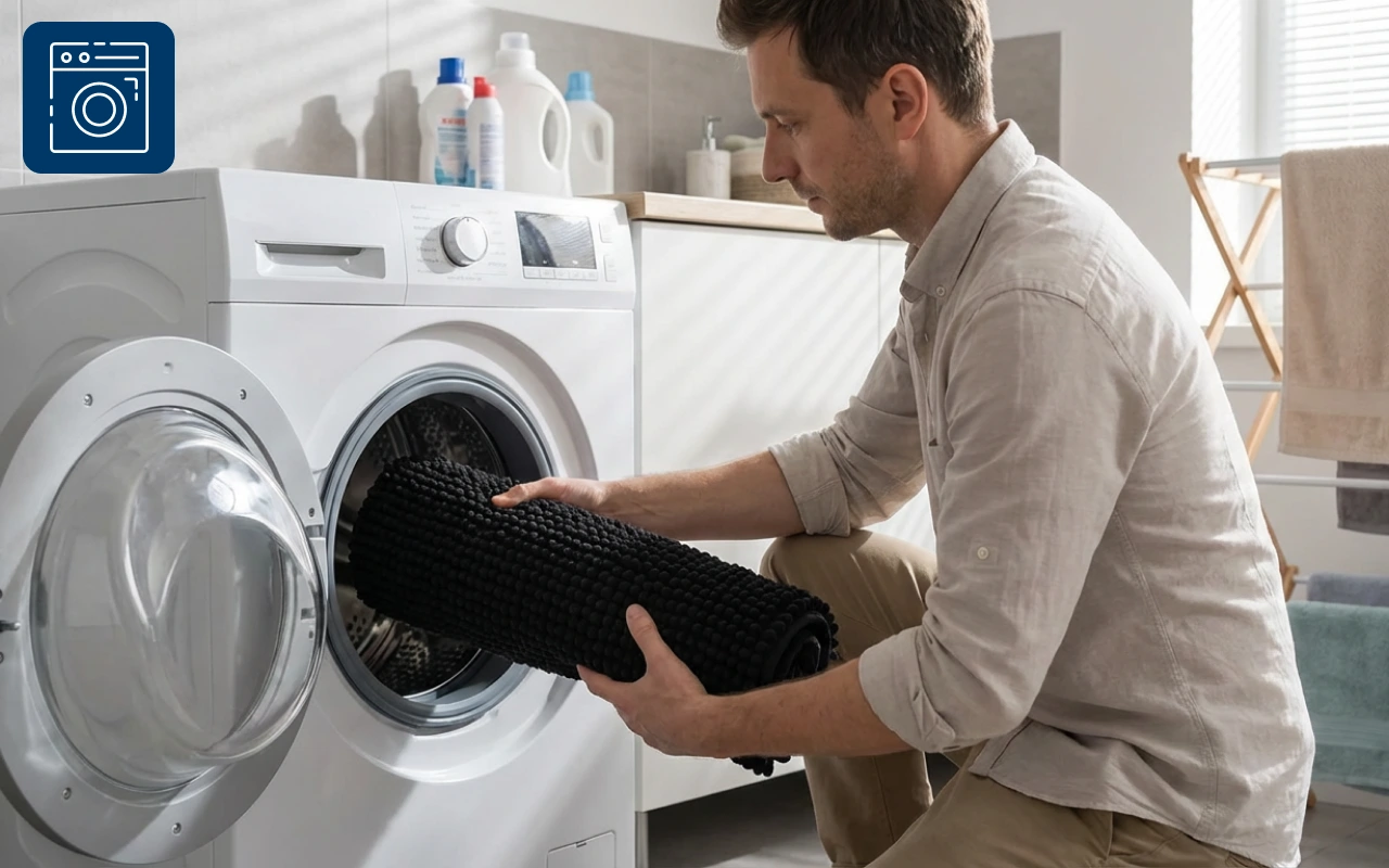 Legen Sie die Matte direkt in die Waschmaschine für eine schnelle Auffrischung. Sie kommt sauber heraus und ist in wenigen Minuten wieder einsatzbereit.