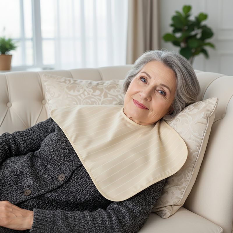 Ich schätze die Haltbarkeit und Weichheit dieses Lätzchens – es reizt den Hals meiner Mutter nicht und bleibt auch nach vielen Wäschen stabil.