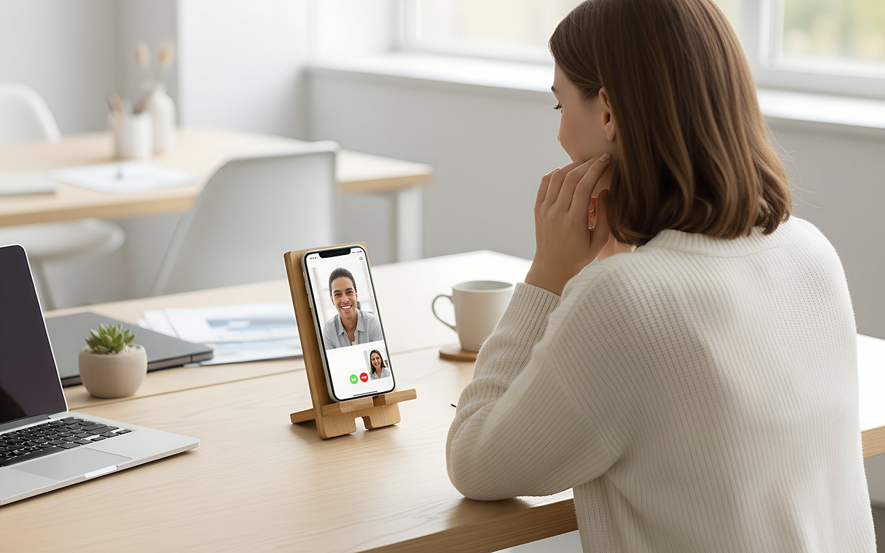 Dieser Holzhalter hält mein Handy stabil für Online-Unterricht. Meine Hände sind frei zum Mitschreiben und mein Nacken tut nicht mehr weh!
